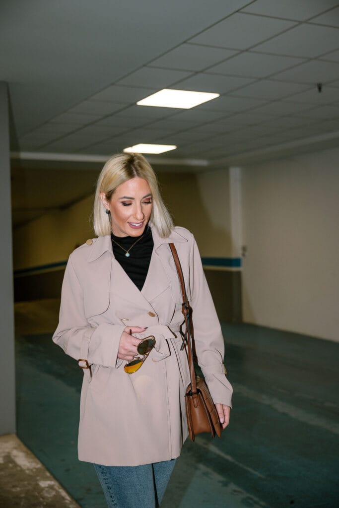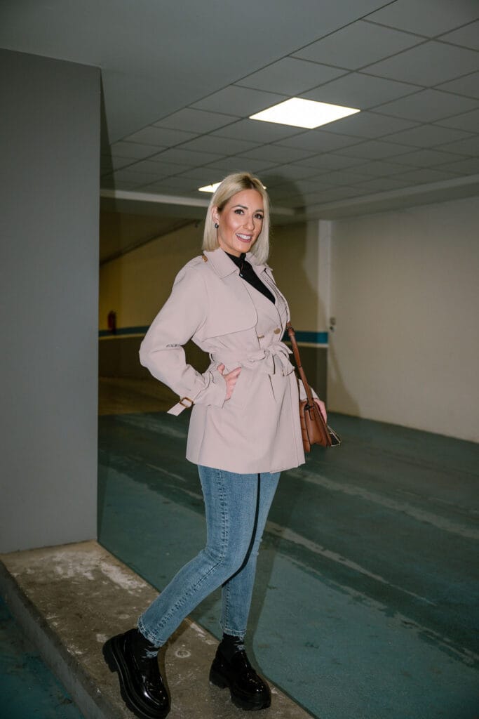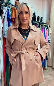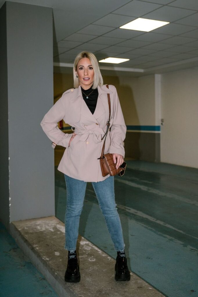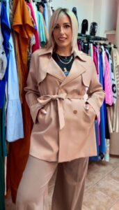 Η καπαρντίνα είναι εκρού, μεσάτη με ζώνη στη μέση, διπλή σειρά κουμπιών, κομψό γιακά και λεπτομέρειες στους καρπούς. Μήκος στο ύψος των γοφών, για casual εμφανίσεις.