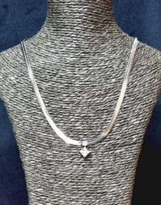 Το κολιέ είναι κατασκευασμένο από ανθεκτικό ατσάλι, που εξασφαλίζει μεγάλη αντοχή και ανθεκτικότητα στο χρόνο. Το ασημένιο φινίρισμα προσδίδει μια κομψή και κομψή εμφάνιση, ενώ το κρεμαστό στρας προσθέτει λάμψη και λάμψη στο σχέδιο.