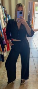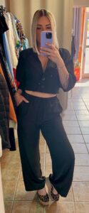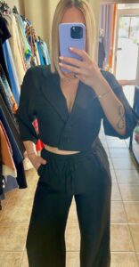 Ένα μοναδικά σικ σετ που συνδυάζει το cropped σακάκι με μοντέρνο μήκος μανικιού και παντελόνι σε άνετη ίσια γραμμή με λάστιχο στη μέση και πρακτικές τσέπες – ιδανικό για δυναμικές, σύγχρονες εμφανίσεις.