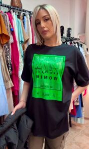 Oversized γυναικεία μπλούζα 100% βαμβάκι σε μαύρο χρώμα με εντυπωσιακό πράσινο τύπωμα στο μπροστινό μέρος. Διαθέτει πλαϊνά ανοίγματα, δημιουργώντας μια μοντέρνα και άνετη εμφάνιση. Ιδανική για casual outfits με urban αισθητική.