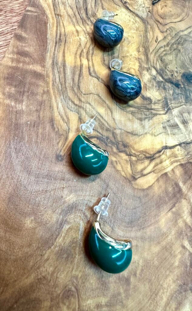 Τα σκουλαρίκια δημιουργούν μια αίσθηση φρεσκάδας και μοντέρνας κομψότητας. Το μαρμάρινο γκρι εφέ και το σκούρο πράσινο χρώμα προσφέρουν μια φυσική και γήινη πινελιά, ενώ το χρυσό μεταλλικό περίγραμμα προσδίδει πολυτέλεια. Το ημισφαιρικό τους σχήμα είναι minimal αλλά παράλληλα εντυπωσιακό, καθιστώντας τα ιδανικά για να ολοκληρώσουν ένα σικ look.