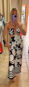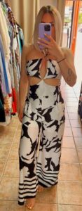 Εντυπωσιακή ολόσωμη φόρμα με ασπρόμαυρο print, κομψά ανοίγματα και κρυφό φερμουάρ στο πλάι για τέλεια εφαρμογή. Διαθέτει απαλή φόδρα στο επάνω μέρος και μέχρι κάτω από τους γοφούς για άνεση και σταθερότητα. Ιδανική για εμφανίσεις που ξεχωρίζουν.