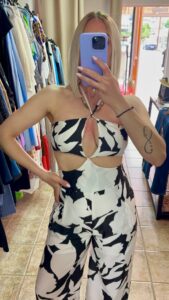 Χρώμα & Σχέδιο: Εντυπωσιακό ασπρόμαυρο μοτίβο με αφηρημένο floral print που δημιουργεί έντονη αντίθεση και υψηλή αισθητική.