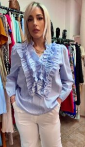 ο Ruffle Striped Crop Shirt είναι η απόλυτη επιλογή για ένα κομψό και μοντέρνο look. Με κάθετες γαλάζιες και λευκές ρίγες, προσφέρει μια φρέσκια και διαχρονική αισθητική, ενώ οι εντυπωσιακές βολάν λεπτομέρειες σε σχήμα V στο μπροστινό μέρος προσθέτουν μια ρομαντική και θηλυκή πινελιά.