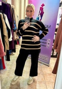 Ανακαλύψτε το Stylish Stripe Knit Top! Αυτό το πλεκτό τοπ, διαθέσιμο σε μαύρο με μπέζ ρίγα, προσφέρει άνεση και στυλ, κατάλληλο για νούμερα μέχρι έξτρα large. Με μοντέρνο σχέδιο και ευέλικτο μέγεθος, είναι η τέλεια προσθήκη στη γκαρνταρόμπα σας. Μη χάσετε την ευκαιρία να το αποκτήσετε και να αναδείξετε την εμφάνισή σας!