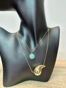 Λεπτό κολιέ με χρυσαφί αλυσίδα και στρογγυλό μενταγιόν, διακοσμημένο με γαλάζια πέτρα τύπου τυρκουάζ, που αποπνέει αρμονία και κομψότητα.
