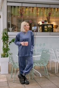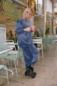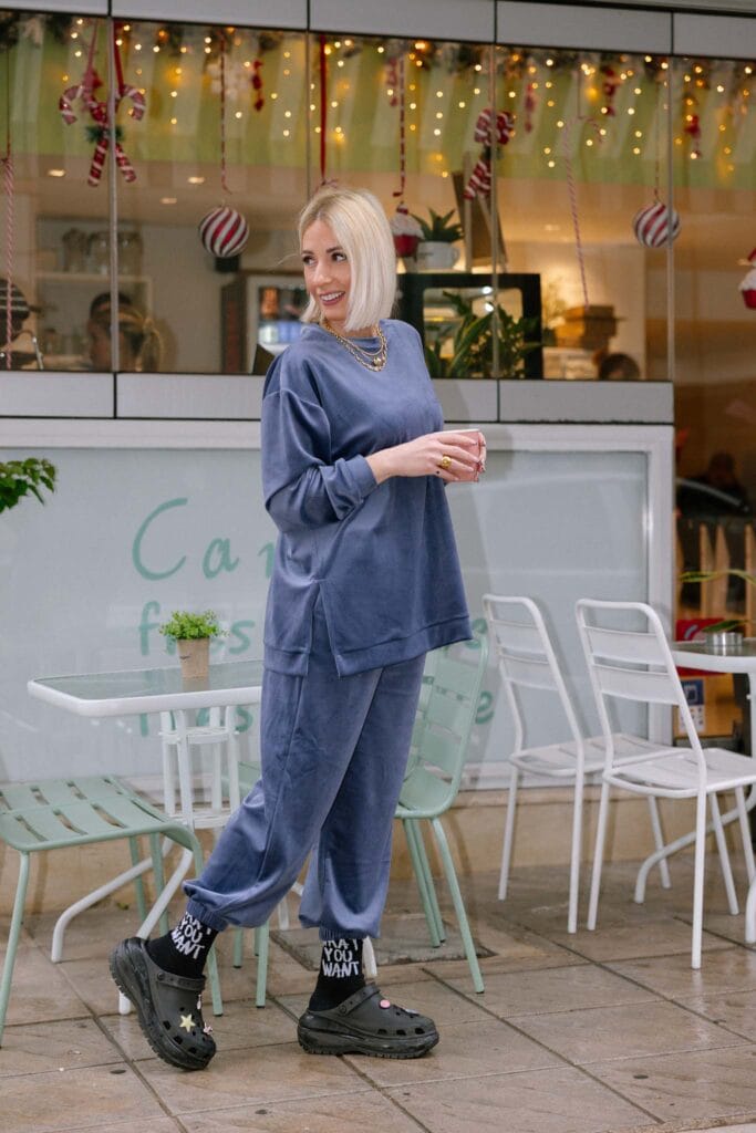 Βελούδινο σετ φόρμας σε μπλε απόχρωση, με μπλούζα με πλαινές σχισμές και tapered παντελόνι με λάστιχο στη μέση και στους αστραγάλους. Ιδανικό για άνεση με στυλ.